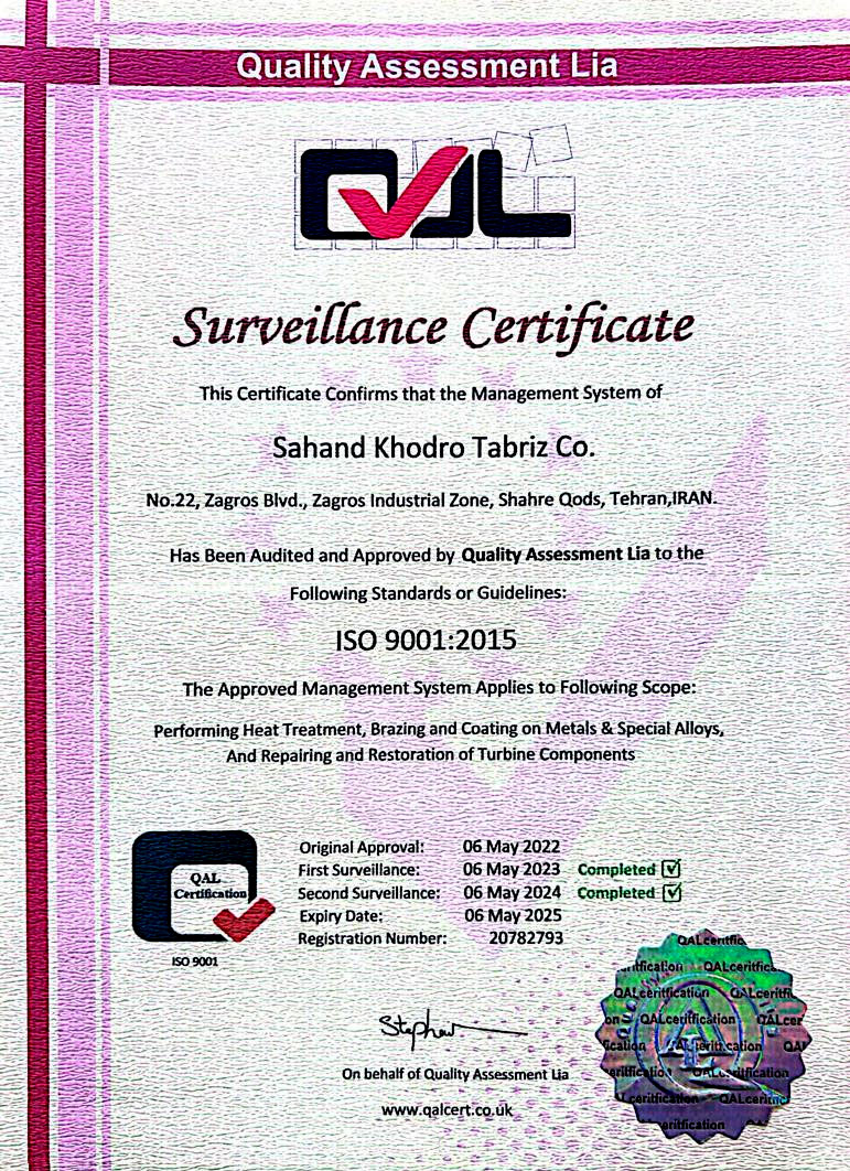 به منظور دستیابی به اصول ذکر شده فوق این شرکت سیستم مدیریت کیفیت را منطبق با استاندارد 2015-9001 ISO در کلیه سطوح به اجرا در آورده و به طور مداوم تمامی کارکنان و همکاران خود را در اجرای اثر بخش این سیستم مسئول می داند.